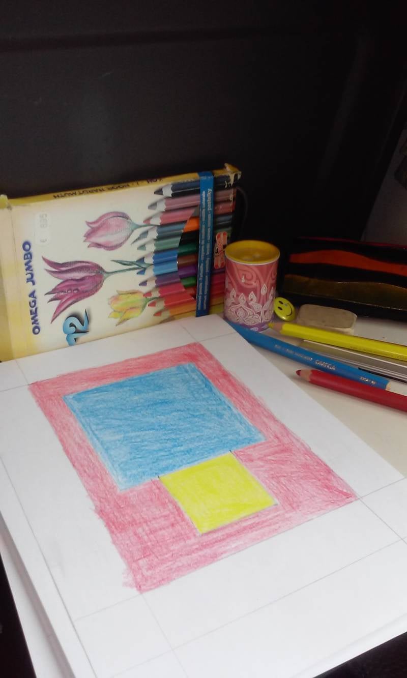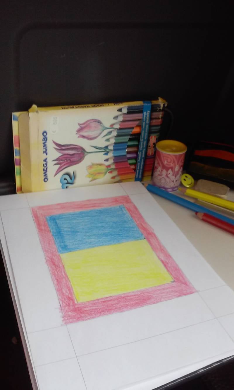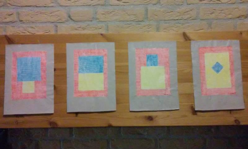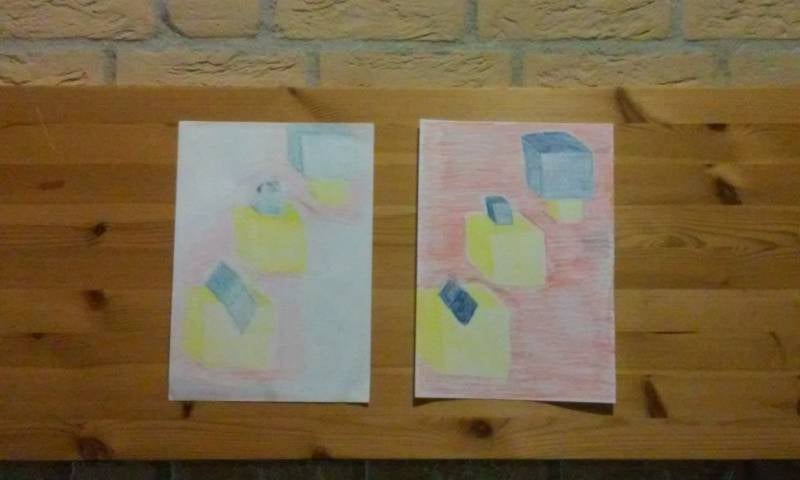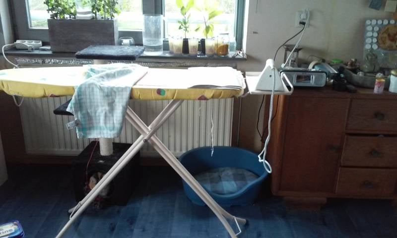 De tekeningen werden tot slot nog gestreken om zoveel mogelijk de bobbels uit het papier te halen. Hare koningklijke kattigheid Oxanni kijkt toe.